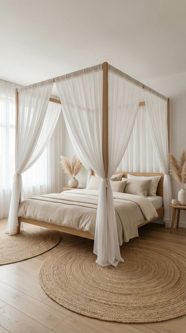 A light-filled canopy bedroom creates an immediate sense of calm. Natural wood tones, soft textiles, and airy layers work together to transform the space into a peaceful retreat that feels both elevated and effortlessly simple.