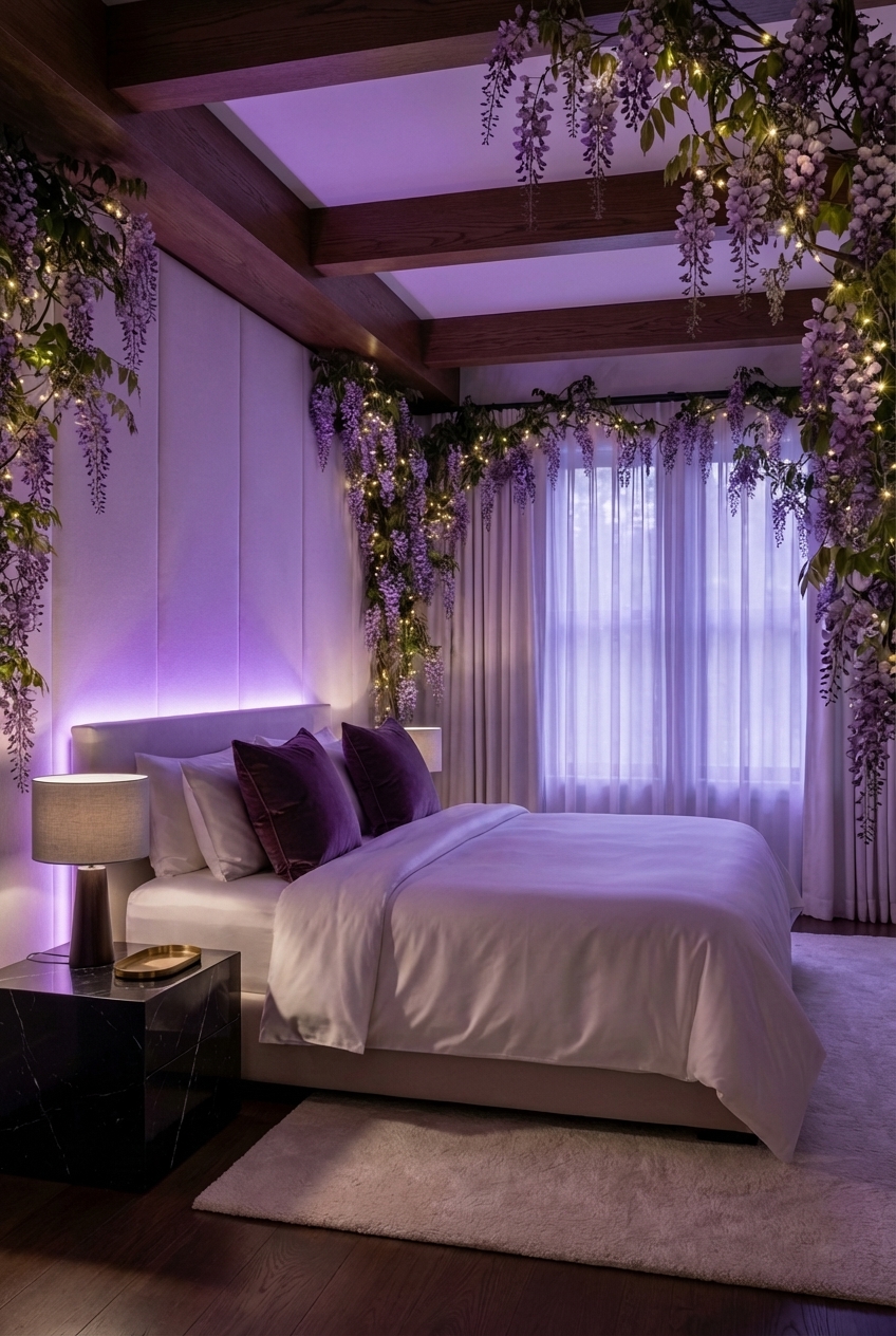 This bedroom look isn’t about copying a single image — it’s about recreating the feeling of a calm, romantic retreat. Soft purple tones, cascading greenery, and layered lighting work together to create a space that feels intimate, cozy, and intentionally styled.