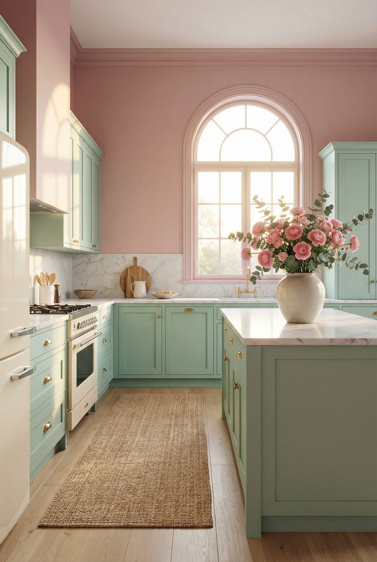 A pastel farmhouse kitchen feels warm, welcoming, and effortlessly charming. Soft sage tones, natural textures, and gentle vintage details come together to create a space that feels bright, calm, and lived-in without feeling overly styled.