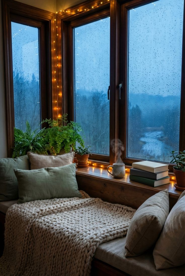 - Warm White Curtain String Lights — Gentle fairy lights frame the window with a soft glow, creating contrast against rainy skies and adding warmth after sunset.